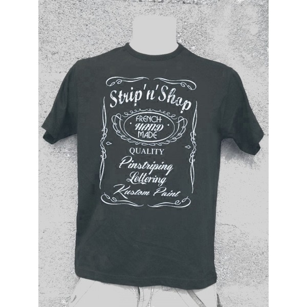Tee-shirt 100% cotton gris bleu avec une impression sérigraphiée à la main sur la poitrine et une autre petite dans le haut du dos, avec les inscription (poitrine) "Strip'n'Shop" en haut, "French Hand made" qui signifit "fait à la main en France" en dessous et "Quality, Pinstriping, Letering, Kustom paint" qui signifit peinture filet au pinceau, lettrage et peinture kustom de qualité !" en bas