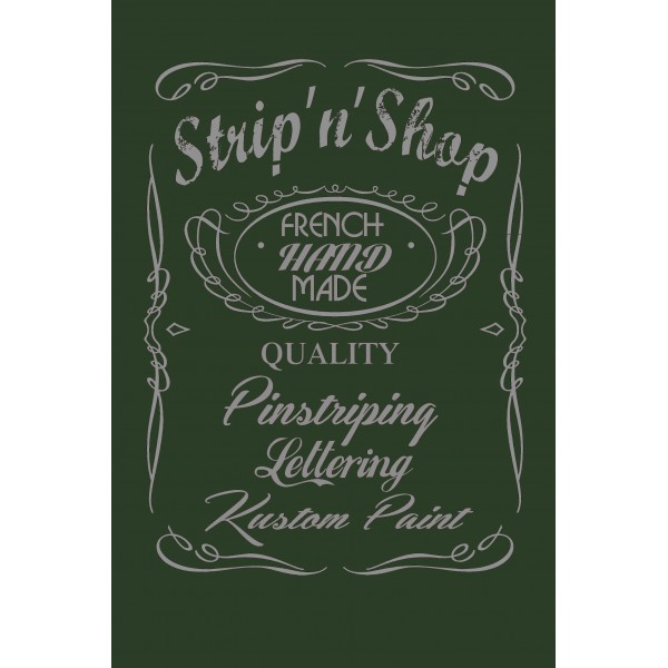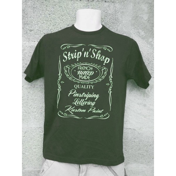 Tee-shirt 100% cotton kaki avec une impression sérigraphiée à la main sur la poitrine et une autre petite dans le haut du dos, avec les inscription (poitrine) "Strip'n'Shop" en haut, "French Hand made" qui signifit "fait à la main en France" en dessous et "Quality, Pinstriping, Letering, Kustom paint" qui signifit peinture filet au pinceau, lettrage et peinture kustom de qualité !" en bas