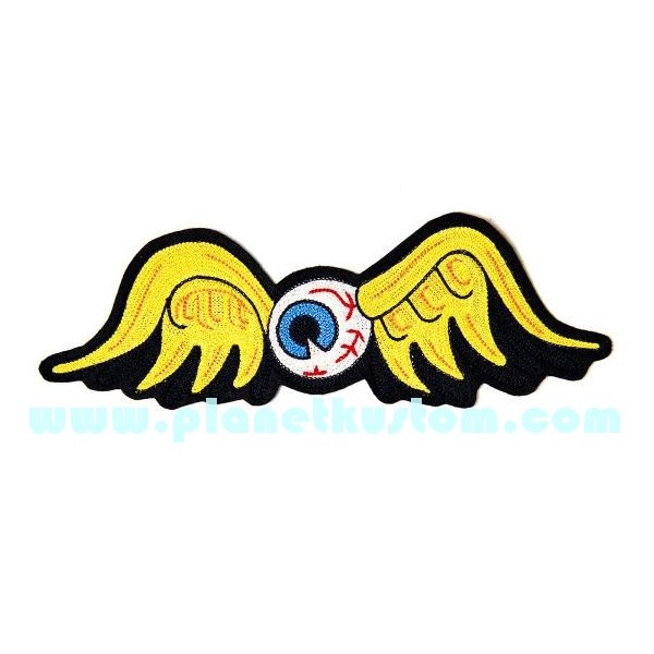 Patch Von Dutch représentant son logo un oeil ailés ou flying eyeball de l'artiste Kenneth Howard (grand nom de la Kustom Kulture, artiste peintre qui à rendue célébre le Pinstriping et la déco peinte à la main ou Kustom peint) , sur fond noir brodé grande taille pour le dos et pour donner un look vintage kustom aux Jakettes, blousons, teddy, chemises ou conbinaisons de travail ou de cours ouautre que vous allez kustomiser !