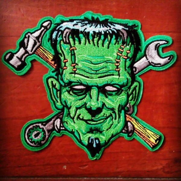 Patch de taille moyenne représentant Franckeinstein en version mécano avec ses outils en croix derrière lui, un marteau et une clef à oeil !, qui lui confère un esprit rebel, biker et kustom pour donner un look aux Jakettes, blousons, teddys, chemises, gilets ou conbinaisons de bikers ou motards que vous allez kustomiser !