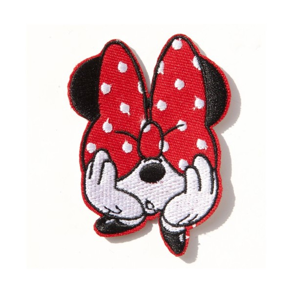 Patch représentant Mini la chérie de Mickey Mouse avec son énorme kiki rouge à pois blanc devant les yeux et en train de bouder, de faire la tête ! pour donner a un look cool au vétement, veste, blouson, gilet, salopette, jackette, chemise, jeans que vous kustomiserez !