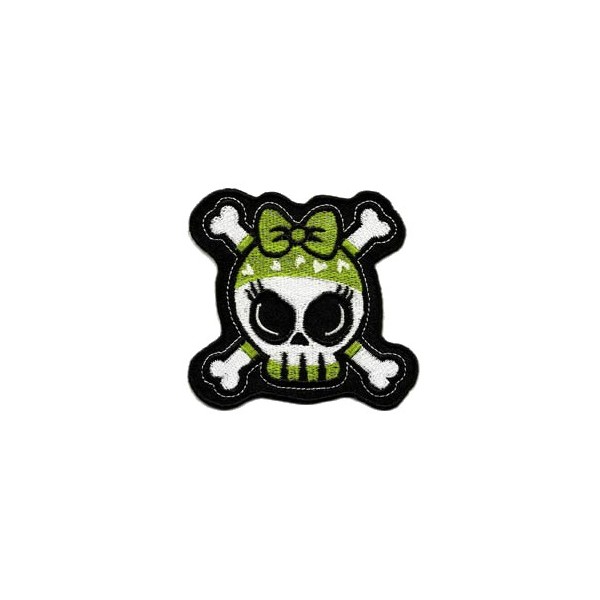 Patch skull girly kiki bandana vert , avec sa tête de mort et son bandana avec noeud vert qui lui confère un esprit vintage et kustom pour donner un look girly pin up aux Jakette, blousons, teddy, chemises, gilets ou conbinaison de nos minis pin up que vous allez kustomiser !