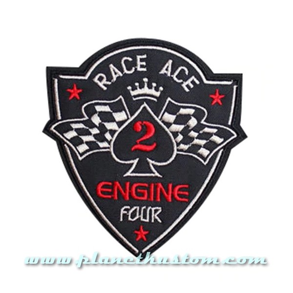 Patch représentant un logo de team de biker ou pilote de course, racer avec au centre un pique avec le chiffre 2 dedant une couronne au dessus et 1 drapeau à damier de chaque côté  avec les inscriptions  "Race ace, engine, four" sur fond noir, avec son esprit kustom biker, racer et kustom pour donner un look sympa à vos Jakettes, blousons, teddy, chemises, gilets, conbinaisons de travail ou de course, tee-shirt, voir même sur les sièges de auto, camions ou de camping... !