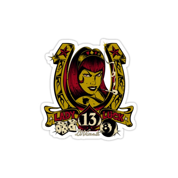 Sticker de D.Vicente représentant une pin up avec une 8 ball, un fer à cheval, 2 dès et un pique avec le numéro 13 à l'intérieur avec en dessous une bannière avec l'inscription " Lady luck ", artiste d'aujourd'hui et Français de la kustom kulture pour donner un esprit rebel, agréssif et kustom à vos meubles, véhicules, camions, voitures, kustoms, hot rod, scooters, bécanes , casques, servantes d'atelier, casiers, vestiaires ou autres que vous allez kustomiser !