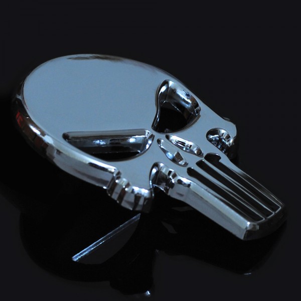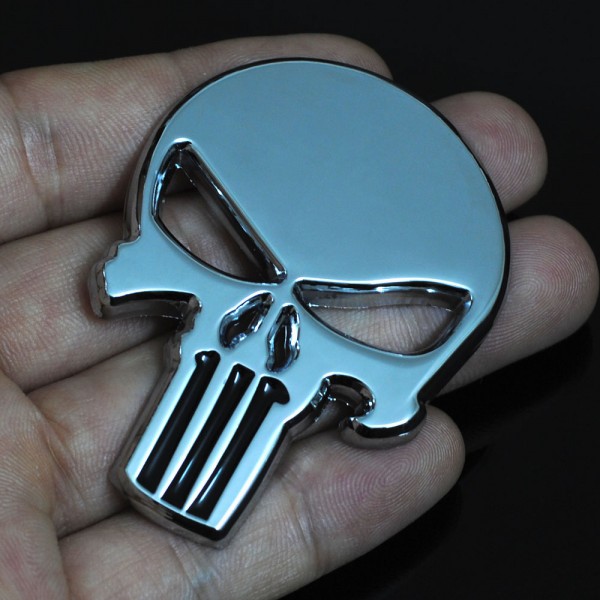 Sticker badge embleme métal 3 d représantant le logo des film et BD comics "The Punisher" couleur chrome, représentant une tête de mort avec de grandes dents très connue dans l'univers du Costplay et des Gamers ou Geeks !, c'est le parfait autocollant pour customiser votre rats, hoodride, patina, rusty, voiture, becane, hot rod, rat rod, volks rod, kustom, low rider, woody, moto, chopper, bobber, casque, caisse à outil, servante d'atelier, casier, vestiaire, guitare, glacière ou pourquoi pas votre frigo?