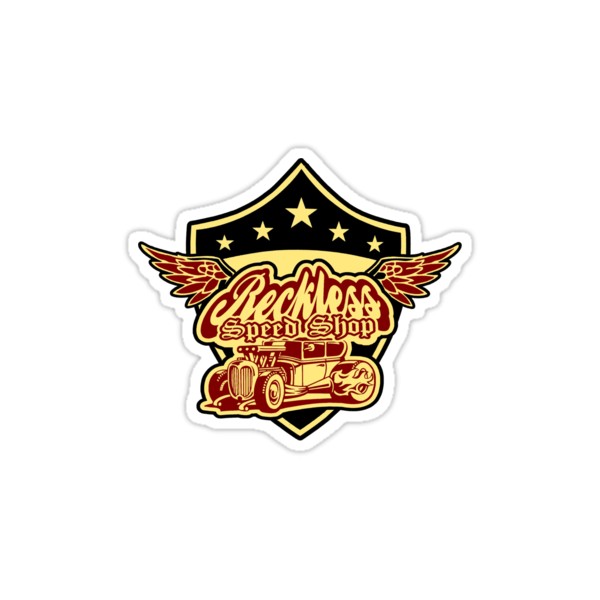Sticker représentant le logo d'un shop avec un rod version cartoon les inscriptions "Reckless, Speed Shop" au dessus du rod et encadré d'ail le tout sur un blason étoilé dans des tons de marron très foncé de jaune pale et de rouge sang, bien old school kustom , pour donner un esprit rebel, agréssif et kustom à vos meubles, véhicules, camions, voitures, kustoms, hot rod, scooters, bécanes , casques, servantes d'atelier, casiers, vestiaires ou autres que vous allez kustomiser !