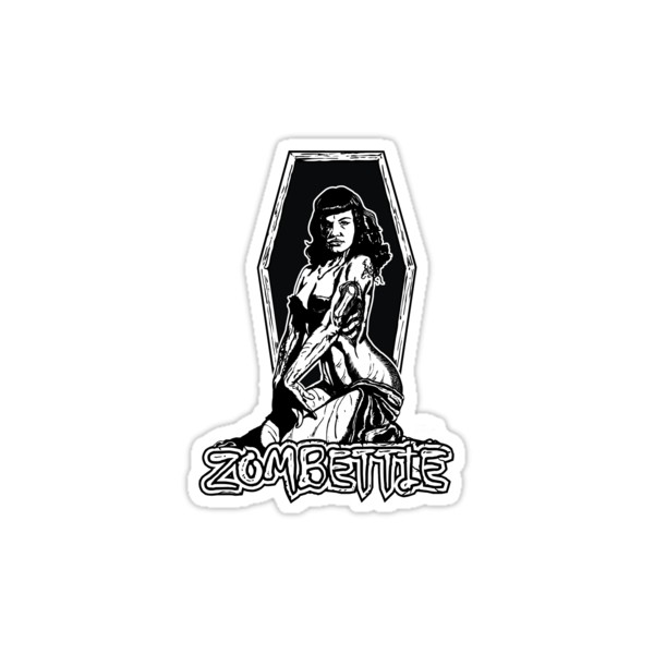 Sticker pin up "zombettie" représantant la pin up par exellance "Bettie page" en version zombie devant son cerceuille le tout en noir et blanc avec l'insciption "Zombettie" en dessous, le parfait autocollant pour customiser votre voiture, moto, vespa, casque, caisse à outil, servante d'atelier, casier, vestiaire, guitare, glacière ou pourquoi pas votre frigo ?