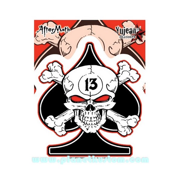 Sticker représntant un skull ou tête de mort avec les os en croix en arrière plan comme sur les drapeaux pirates avec le chiffre 13 sur le front, il a les yeux rouge et il est posé sur la couleur de carte "Pique" !, le parfait autocollant pour customiser votre skateboard, longboard, surf, voiture, hot rod, rat rod, volks rod, kustom, low rider, woody, moto, chopper, bobber, casque, caisse à outil, servante d'atelier, casier, vestiaire, guitare, glacière ou pourquoi pas votre frigo?