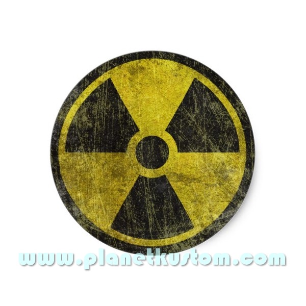 Sticker représntant un panneau de signalisation de zone Radioactive avec le trisecteur avertissant une zone de danger risque de contamination industriel radioactif, danger zombie en version usé !, c'est le parfait autocollant pour customiser votre voiture, hot rod, rat rod, volks rod, kustom, low rider, woody, moto, chopper, bobber, casque, caisse à outil, servante d'atelier, casier, vestiaire, guitare, glacière ou pourquoi pas votre frigo ou arme ou coffret ou mallette de votre airsoft ou paintball gun ?