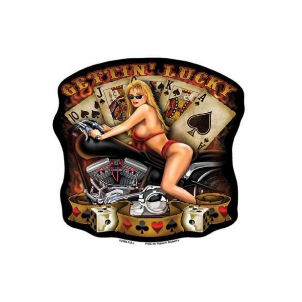 Sticker une pin up blonde en maillot de bain 2 pièces rouge avec des lunette de soleil assise sur une moto avec moteur en V de type Harley Davidson avec en fond une quinte floche royale à pique et en bas dans une banière des dès et la couleur des cartes , pique , coeur, careau et treffle et tout en haut l'inscription "Gettin' lucky" le tout sur fond noir avec un flaming pour kustomiser votre voiture, woody, hot rod, kustom car, cool car, cox, combi, moto, casque, guitare ou instrument préféré, casier d'atelier, vestière, bureau, caisse à outil, ou pourquoi pas votre frigo?