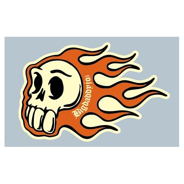 Sticker de "Bigdaddyjo" représentant une tête de mort (skull) avec l' inscription "Bigdaddyjo" dans un flaming orange sur fond crème, le parfait autocollant pour customiser votre voiture, hot rod, rat rod, volks rod, kustom, low rider, woody, moto, chopper, bobber, casque, caisse à outil, servante d'atelier, casier, vestiaire, guitare, glacière ou pourquoi pas votre frigo?