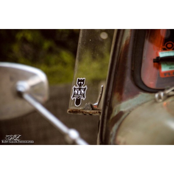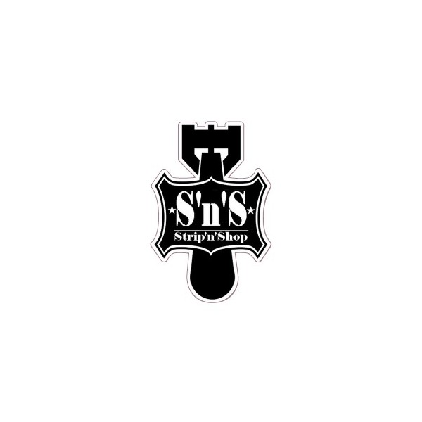 Sticker de "Enzocox" représentant une bombe avec un fanion au milieu, sur fond noir bordé de blanc, avec les inscriptions de haut en bas "S'N'S" puis "Strip'n'Shop" , pour soutenir votre shop préféré !, le parfait autocollant pour customiser votre voiture, hot rod, rat rod, volks rod, kustom, low rider, woody, moto, chopper, bobber, casque, caisse à outil, servante d'atelier, casier, vestiaire, guitare, glacière ou pourquoi pas votre frigo?