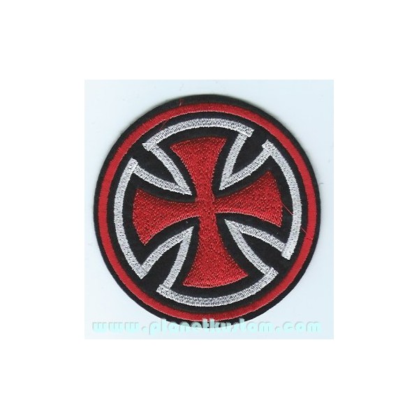 Patch croix de malt brodé tour argenté, puis noir avec intérieur en rouge encerclé de rouge, façon "Indépendent" iron cross, idéal pour kustomiser vos jackettes, blousons, vestes, gilets, chemises, short, baggy ou autres et leur apporter une touche kustom !