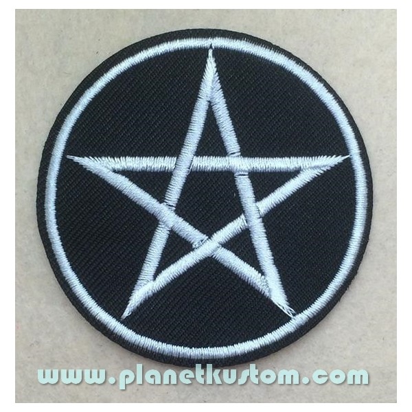 Patch représentant un pentacle couleur argent dans un rond noir, amulette magic servant à invoquer des force ou esprit comme satan et des démons, celà lui confère un esprit kustom pour donner un look cool et rétro, voir vintage aux Jakettes, blousons, teddys, chemises, gilets ou conbinaisons de travail ou de cours que vous allez kustomiser !