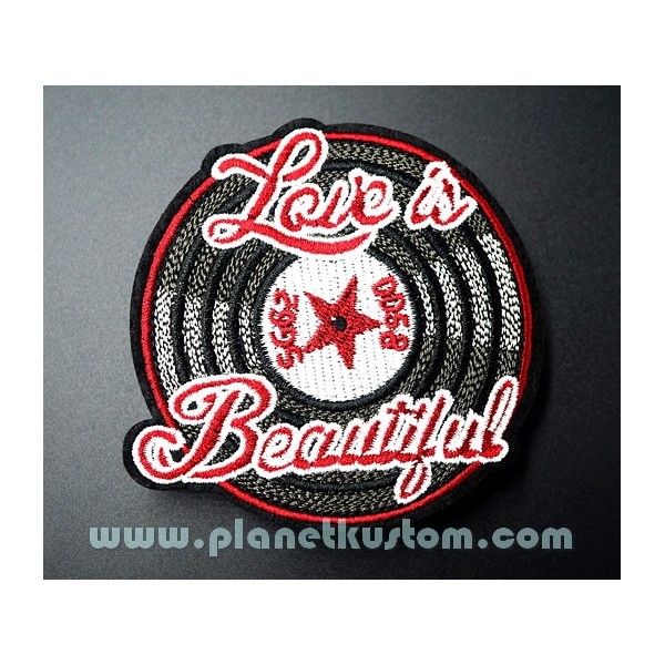 Patch représentant un disque vinyl avec une étoile rouge en son centre et avec des inscriptions qui le tarverse "Love is beautiful" qui veux dire "c'est beau l'amour" pour donner un esprit rock'n'roll et kustom à vos Jakettes, blousons, teddy, chemises, gilets ou conbinaison de cours ou de travail que vous allez kustomiser !