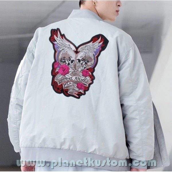 Patch de grande taille plutôt dédié aux dos des vétement représentant 2 skulls ou têtes de mort se regardant avec des ailes au dessus d'eux, des roses en dessous ainsi qu'une banière avec l'inscription "Lethal Angel" qui veux dire "Ange Mortel", sur fond noir avec son esprit biker et kustom pour donner un look sympa à vos Jakettes, blousons, teddy, chemises, gilets, conbinaisons de travail ou de course, tee-shirt, voir même sur les sièges de auto, camions ou de camping... !
