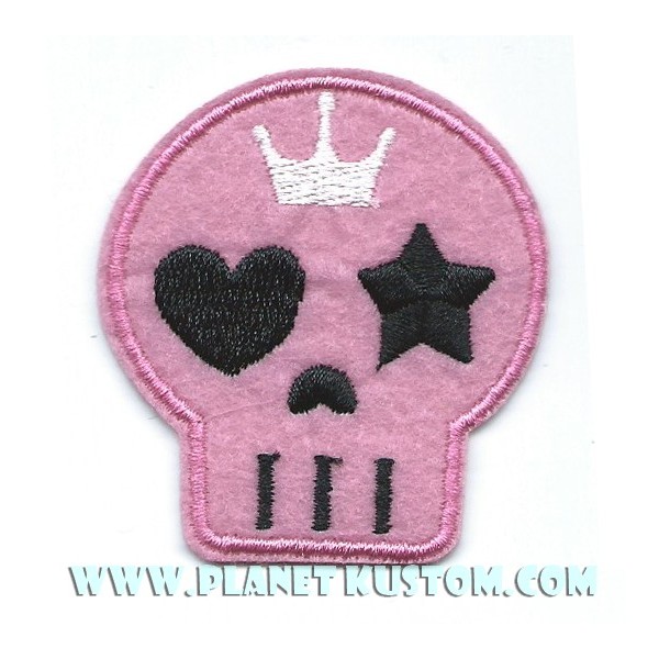 Patch skull girly , avec sa tête de mort rose et scourone argenté sur le front et ses coeurs et étoiles noir à la place des yeux, qui lui confère un esprit vintage et kustom pour donner un look girly pin up aux Jakette, blousons, teddy, chemises, gilets ou conbinaison de nos minis pin up que vous allez kustomiser !
