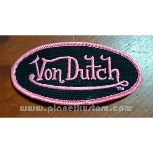 Patch Von Dutch signature de l'artiste Kenneth Howard (grand nom de la Kustom Kulture, artiste peintre qui à rendue célébre le Pinstriping et la déco peinte à la main ou Kustom peint) avec écrit "Von dutch" en rose sur fond noir bordé de rose, brodé pour donner un look vintage kustom aux Jakettes, blousons, teddy, chemises ou conbinaisons de travail ou de cours ouautre que vous allez kustomiser !