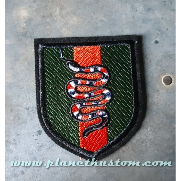 Patch représentant un fanion militaire, commando armée kaki avec un red sneek au milieu en rouge sang argent etnoir sur fond de bande rouge au milieu d'un fond kaki bordé de noir pour donner un look militaire, commando aux Jackets, blousons, chemise, tee-shirt ou conbinaison de travail ou de cours que vous allez kustomiser !