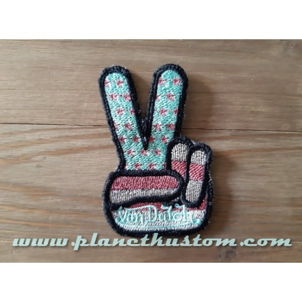 Patch Von Dutch old stock de l'artiste Kenneth Howard (grand nom de la Kustom Kulture,écrit en bleu ciel "Von dutch" au bas d'une main qui fait le signe V comme victoire sur fond bleu ciel, rose et gris façon drapeau US, brodé pour donner un look vintage racing kustom aux Jakettes, blousons, teddy, chemises ou conbinaisons de travail ou de cours ouautre que vous allez kustomiser !
