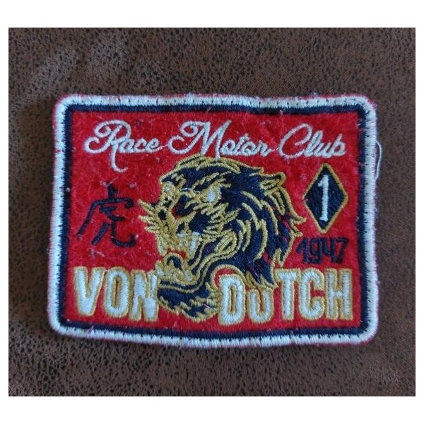 Patch Von Dutch old stock rare de l'artiste Kenneth Howard (grand nom de la Kustom Kulture, artiste peintre qui à rendue célébre le Pinstriping et la déco peinte à la main ou Kustom peint) avec écrit "Von dutch, race motor club first place" avec un tigre ! brodé dans des tons de rouge, or, gris et noir pour donner un look vintage kustom aux Jakettes, blousons, teddy, chemises ou conbinaisons de travail ou de cours ouautre que vous allez kustomiser !