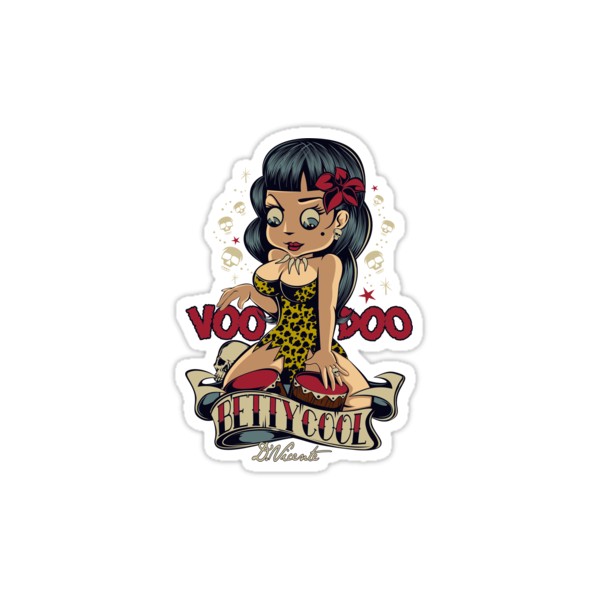 Sticker de D.Vicente représentant une pin up façon beety boop avec les insciptions "betty cool" dans une bannière sous elle et " voodoo", artiste d'aujourd'hui et Français de la kustom kulture pour donner un esprit rebel, agréssif et kustom à vos meubles, véhicules, camions, voitures, kustoms, hot rod, scooters, bécanes , casques, servantes d'atelier, casiers, vestiaires ou autres que vous allez kustomiser !