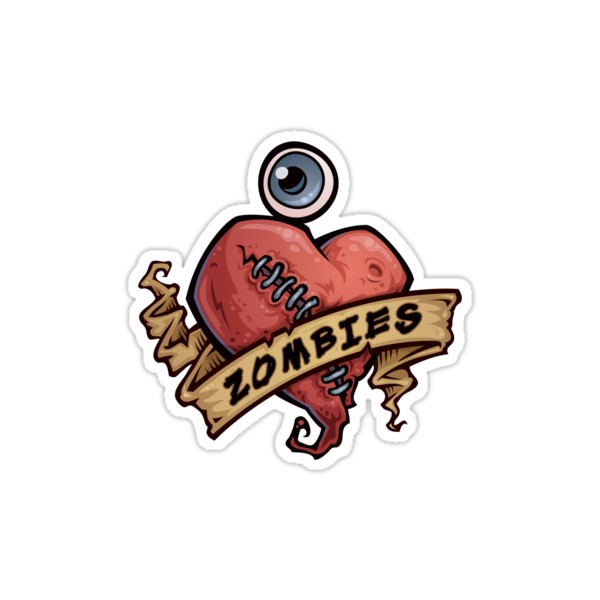 Sticker représentant un coeur zombie avec une banière comportant l'insxcription "Zombie", un oeil est juste au dessus du coeur,  pour donner un esprit rebel, umouristique kustom à vos meubles, véhicules, camions, voitures, kustoms, hot rod, scooters, bécanes , casques, servantes d'atelier, casiers, vestiaires ou autres que vous allez kustomiser !