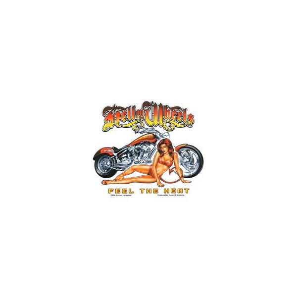 Sticker autocollant avec une pin up sexy devant un chopper type Harley Davidson avec les inscriptions "hell on wheels" en haut et "Feel the heat" en bas !  pour customiser votre voiture, votre moto, votre casque, votre guitare ou pourquoi pas votre frigo ou cisse à outil ou servante d'atelier ?