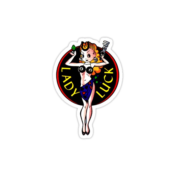 Sticker pin up oldschool représentant une des première "Lady Luck" avec les inscription "Lady Luck" qui signfi "Miss ou madame pourte bonheur ou chance" avec tout se porte bonheur (treffle à 4 feuilles, fer à cheval...), le parfait autocollant pour customiser votre voiture, moto, vespa, casque, caisse à outil, servante d'atelier, casier, vestiaire, guitare, glacière ou pourquoi pas votre frigo?