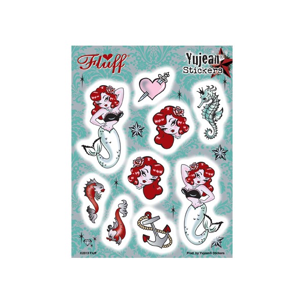 Sticker de "Fluff!" représentant des pin up sirène oldschool,, des hypoquampes, des poissons, une ancre marine, et un coeur avec une épé qui le transperce ! les parfait autocollants pour customiser votre voiture, lowrider, hot rod, rat rod, volks rod, woody, kustom, low rider, moto, chopper, bobber, vespa, scooter, lambretta, casque, caisse à outil, servante d'atelier, casier, vestiaire, guitare, glacière ou pourquoi pas votre frigo?