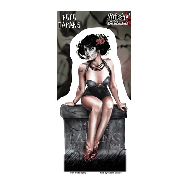 Sticker représntant une pin up méxicaine miss santa muerte lié à la fête des mort méxicaine "Dia de los muertos" qui signifie "Jour des morts", aussi connue sous le nom de lady Guadalupe, ou encore Dona sébastiana, ici notre pin up sexy a le visage paint pour la fête des morts méxicaine, elle est légérement vétue de noir avec une rose dans les cheuveux, et est assise sur une tombe ! c'est le parfait autocollant pour customiser votre voiture, hot rod, rat rod, volks rod, kustom, low rider, woody, moto, chopper, bobber, casque, caisse à outil, servante d'atelier, casier, vestiaire, guitare, glacière ou pourquoi pas votre frigo?