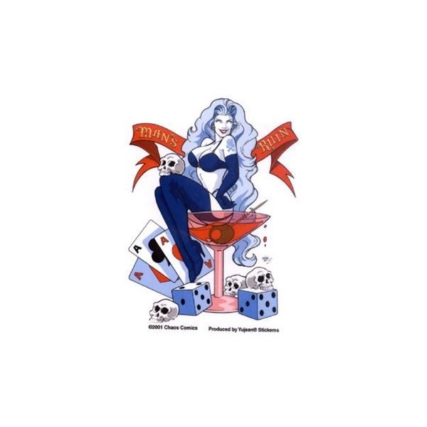 Sticker d'une pin up sexy acise dans un verre à cocktail avec en fond des dès à jouer et tois as, une banière rouge passe derière elle avec les inscriptions "man's ... ruin" avec quelques skull ou tête de morts dont un sur ses genoux !, le parfait autocollant pour customiser votre voiture, hot rod, rat rod, volks rod, kustom, low rider, moto, chopper, bobber, casque, caisse à outil, servante d'atelier, casier, vestiaire, guitare, glacière ou pourquoi pas votre frigo?