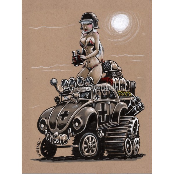 Sticker pin up militaire en maillot de bain mais avec un casque allemand assise sur le toit d'une cox ou bettle, ou coccinelle Volkswagen version militaire ou army avec la croix allemande sur les portières et le capot avant modifier à la façon mad max dans un décor très cartoon de desert ! c'est le parfait autocollant pour customiser votre voiture, moto, vespa, casque, caisse à outil, servante d'atelier, casier, vestiaire, guitare, glacière ou pourquoi pas votre frigo?
