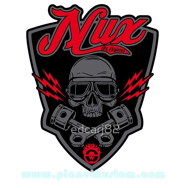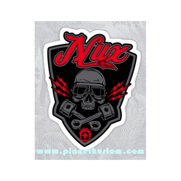 Sticker représntant un des logo apparaissant dans les films "Mad Max" ici c'est celui des War Boys et du clan "Nux" avec en son centre la tête de mort ou skull avec ses lunettes de conduite des éclaires rouge qui sorte de chaque côtés avec des pistons croisé dessous et les inscriptions "Nux, Car Custom" en haut, le tout dans des tons de rouge sang, de noir et de gris, c'est le parfait autocollant pour customiser votre voiture, hot rod, rat rod, volks rod, kustom, low rider, woody, moto, chopper, bobber, casque, caisse à outil, servante d'atelier, casier, vestiaire, guitare, glacière ou pourquoi pas votre frigo?