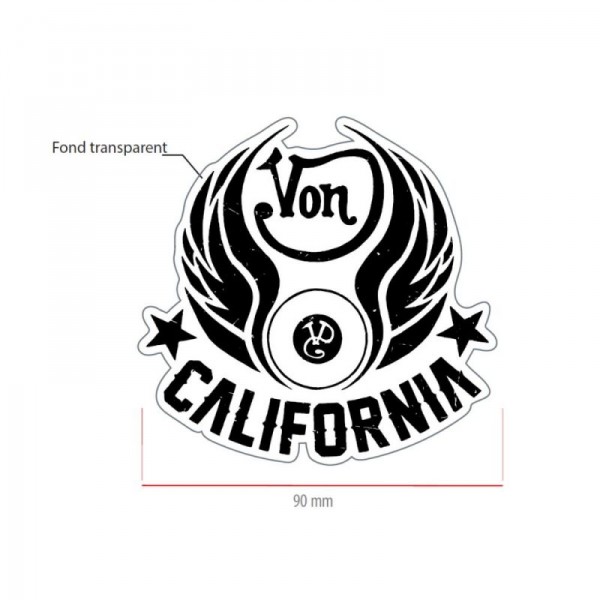 Sticker de "Von Dutch"  alias "Kenneth Howard" artiste modialement connu de Kustom Kulture entre autre pour ses talents de Pinstriper et de lettering, représentant un des logos de la marque avec une autre version du flying eye ball avec les inscriptions "von" au milieu des ailes et en dessous "california" entre 2 étoiles, sur fond transparent et écritures noires, le parfait autocollant pour customiser votre voiture, hot rod, rat rod, volks rod, kustom, low rider, woody, moto, chopper, bobber, casque, caisse à outil, servante d'atelier, casier, vestiaire, guitare, glacière ou pourquoi pas votre frigo?