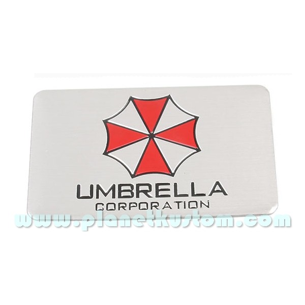 Sticker badge embleme métal 3 d représantant le logo "Umbrella Corporation" avec le logo en plein centre et en dessous l'inscription "Umbrella" de forme rectangulaire sur fond alu brossé,  visible dans le jeux vidéo "Résident évil" très connue dans l'univers du Costplay et des Gamers ou Geeks !, c'est le parfait autocollant pour customiser votre rats, hoodride, patina, rusty,  voiture, becane, hot rod, rat rod, volks rod, kustom, low rider, woody, moto, chopper, bobber, casque, caisse à outil, servante d'atelier, casier, vestiaire, guitare, glacière ou pourquoi pas votre frigo ?
