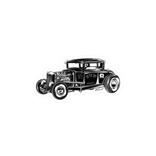 Sticker de D.Vicente représentant un hot rod ford 32 old school kustom en noir et blanc, artiste d'aujourd'hui et Français de la kustom kulture pour donner un esprit rebel, agréssif et kustom à vos meubles, véhicules, camions, voitures, kustoms, hot rod, scooters, bécanes , casques, servantes d'atelier, casiers, vestiaires ou autres que vous allez kustomiser !