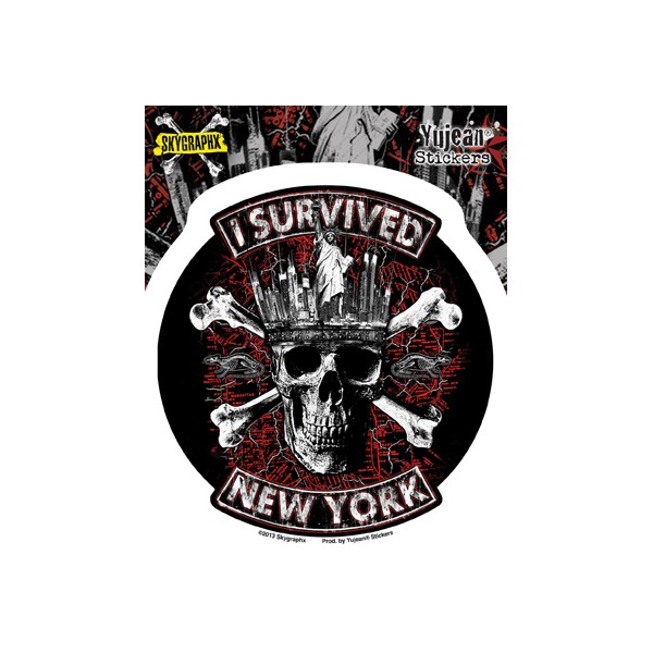 Sticker représntant un skul ou têtes de mort avec l'inscription "I survived New York" qui signifit "J'ai suvécu, New York", le parfait autocollant pour customiser votre voiture, hot rod, rat rod, volks rod, kustom, low rider, woody, moto, chopper, bobber, casque, caisse à outil, servante d'atelier, casier, vestiaire, guitare, glacière ou pourquoi pas votre frigo?