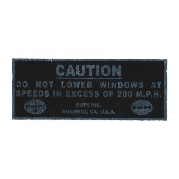 Sticker de la célébre marque Empi distributeur d'équipement auto racing, dragster, volkswagen avec les inscriptions "Caution" en gros en haut et souligné qui veux dire attention et en dessous en plus petit les inscriptions " do not lower windows at speeds in excess of 200 M.P.H." qui signifit "ne pas ouvrir les fenetres au delà de 200 Mettre par heure écritures et cadre en chrome sur fond noir brillant, le parfait autocollant pour customiser votre voiture, moto, vespa, casque, caisse à outil, servante d'atelier, casier, vestiaire, guitare, glacière ou pourquoi pas votre frigo ?